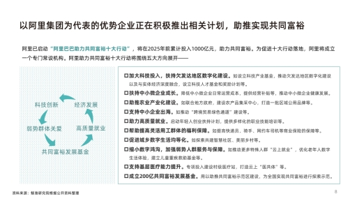 目前,部分数字经济企业已陆续开始布局,以数字生态产业助推实现共同富裕。如阿里云作为数字经济领军企业,具备众多数字技术优势和丰富数字解决方案经验。此外,阿里集团已启动“阿里巴巴助力共同富裕十大行动”,将在2025年前累计投入1000亿元,助力共同富裕。“十大行动”将围绕科技创新、弱势群体关爱、共同富裕发展基金、高质量就业、经济发展五大方向展开。