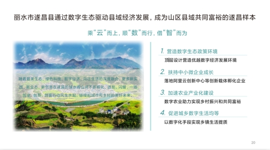 浙江省丽水市遂昌县与阿里集团进行紧密合作。白皮书也进一步总结了遂昌山区县域共同富裕样本的发展经验。遂昌县以阿里优势和遂昌政策为抓手,营造数字生态政策环境、扶持中小微企业成长、加速农业产业化建设及乡村电子商务、促进城乡数字生活均等化,由此,实现落地优势资源,链接优质项目,培育创新人才目标,共同推动当地经济发展。