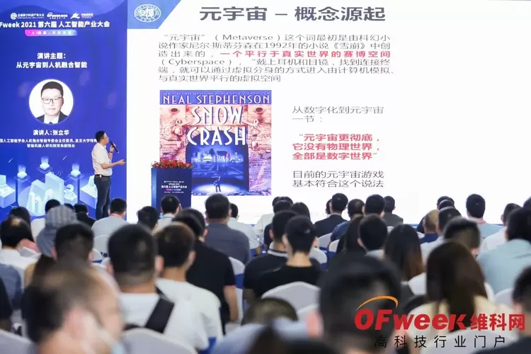 “元宇宙被广泛认为是下一个互联网流量入口之一,目前多家巨头已经通过投资入局元宇宙,”中国人工智能学会人机融合智能专委会主任委员,复旦大学特聘教授,智能机器人研究院常务副院长张立华在《从元宇宙到人机融合智能》主题演讲中提到,“元宇宙(Metaverse)概念最初是由科幻小说作家尼尔·斯蒂芬森在1992年的小说《雪崩》中创造出来的,它指的是一个沉浸在其中的、栩栩如生的虚拟世界,如此复杂、有用、令人信服,以至于很难将它严格地从属于‘现实世界’。”