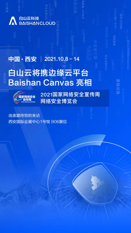 “网络安全为人民,网络安全靠人民”,2021年国家网络安全宣传周(下称“网络安全周”)在中央网信办指导下将于10月8日至14日在西安国际会展中心举办。作为创新的边缘云平台服务提供商,白山云将携边缘云平台Baishan Canvas亮相网络安全周。