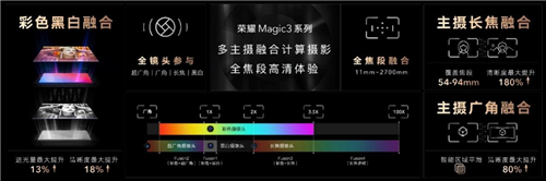 据了解,荣耀Magic3系列搭载的荣耀首创全新多主摄融合计算摄影技术,是手机摄影的一次全新突破。在深化AI计算摄影能力的同时,多主摄融合计算摄影技术以黑白、彩色以及不同焦段镜头为信息源,通过多维度、多模态信息融合技术,丰富捕获信息量,实现全焦段高清影像体验,基于强大的底层技术能力让所见之处更清晰。荣耀Magic3系列凭借创新技术进一步夯实全能科技旗舰定位,推动移动影像技术的革命性升维,为行业树立了顶级影像新标杆。