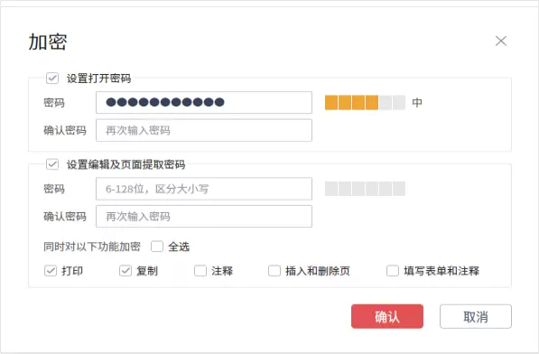 金山PDFforLinux专业版支持对文件设置打开权限、编辑权限,可对打印、复制、编辑、增删页面等功能进行加密,密码强度最大支持128位。