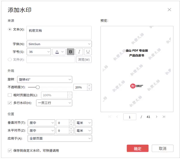 金山PDFforLinux专业版兼容并支持识别第三方软件如 Adobe等添加的水印,可删除、更改文档自身创建已有水印,新增水印支持文本、外观和位置的设置。