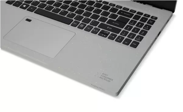 宏碁Vero蜂鸟·未来 环保版作为宏碁首款环保概念笔记本,除了机身采用30%PCR材质,键盘采用50%PCR材质外,显示屏更使用超过99%的可回收面板,此举相较于使用原生塑料的笔记本,每台减少了约21%的碳排放。同时为减少污染,机身表面并未使用涂料,而是展现材料本身颜色,星空灰点缀黄色斑点,轻快之中充满活力,并且不含VOC,减少对于环境污染与资源浪费并保证用户使用健康。