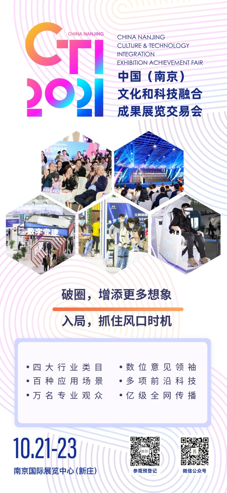 10月21日-23日,南京国际展览中心,2021中国(南京)文化和科技融合成果展览交易会将再度拉开帷幕,以21000㎡兼具概念方案、技术产品、应用场景的集成展区,搭配高层论坛、项目招商、合作交流等同期活动,展示极具引领性的文化数字化产业图景,携手来自全国各地的行业从业者、意见领袖上演一场金秋大制作!