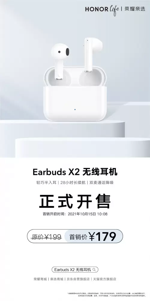 10月15日上午10:08,荣耀亲选Earbuds X2真无线耳机正式开售。该产品首销优惠价为179元,与双11同价,感兴趣的用户可前往各大电商平台荣耀官方授权店及荣耀授权门店进行预约购买。