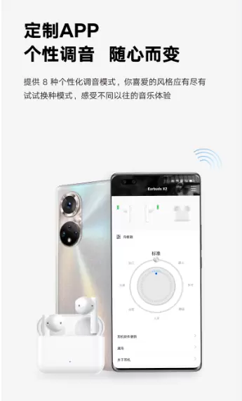 荣耀亲选Earbuds X2耳机12mm生物振膜大动圈,配合轻质铜包铝音圈,呈现澎湃低音与开阔声场。除了硬件,荣耀亲选Earbuds X2耳机还可以通过手机更改调音模式,提供标准、爵士、乡村、舞曲、人声、自然、古典、流行共8种模式。无论用户喜欢哪种风格,都能获得高品质音质带来的听觉享受。