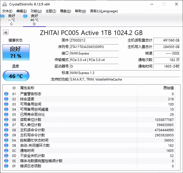 CrystalDiskInfo按照1024进制来显示主机写入量,如果按存储行业通行的1000进制来计算的话,下图中SSD写入的数据量已经超过305TBW。致钛PC005 Active 1TB的标称写入耐久度为640TBW,305TB写入大致相当于已近中年。