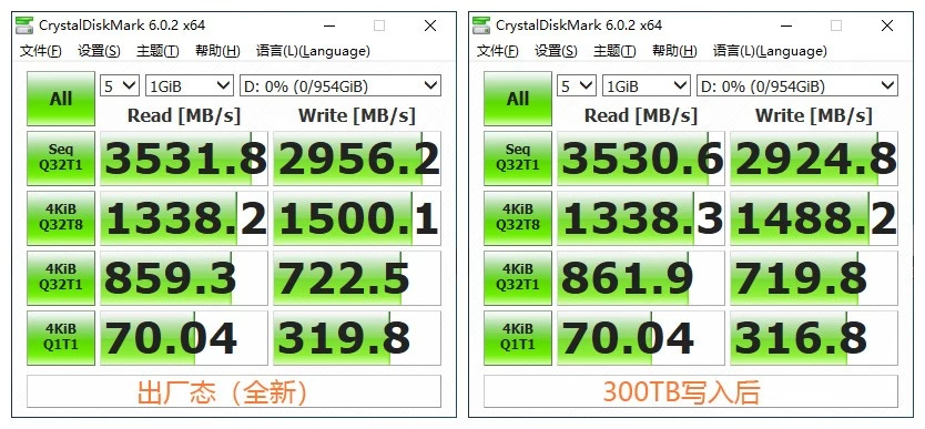 分析完以上内容之后,我们来总结一下本次的测试结果,首先是对致钛PC005 Active固态硬盘的一个肯定:在写入超过300TB的数据之后,它的使用性能同新盘出厂态相比基本没有变化,做到了品质如一。