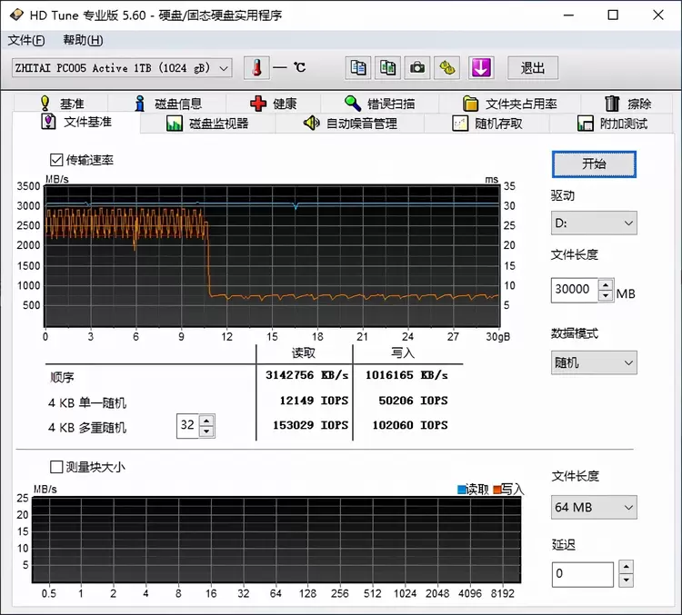 HDTune文件基准测试结果显示,致钛PC005 Active的SLC缓存容量依然是10GB左右。虽然缓存容量不大,但释放算法比较积极,在日常家用中很少会遇到缓存写爆的情况。