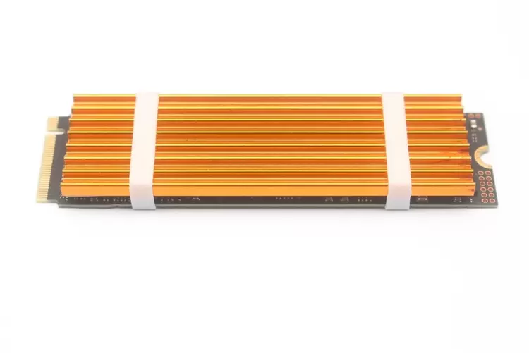 第二个是在购买SSD的时候一些淘宝商家会直接赠送的简易散热片,它只有一块,并且厚度比较薄,通过橡皮筋固定在SSD上。这种散热片成本比较低,绑带长期使用后容易老化导致散热片脱落,优点是空间兼容性比较好:很多M.2插槽底部高度有限制,上图中的那种三明治散热片就无法安装,只能使用下图中的简易散热片。
