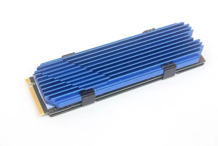 既然性能上没有问题,接下来就要加练一些更高难度的项目了:满负荷压力测试。我们为致钛PC005 Active准备了两副“战甲”。第一个是比较常见的三明治结构,正面有一中等厚度的立体金属散热片、背面是一张平面金属散热片,二者通过金属卡扣结合,将SSD夹在中间: