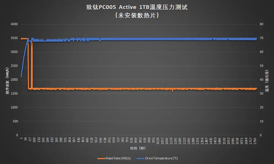 在27度室温、未安装散热片的初始状态下,满载测试开始52秒后致钛PC005 Active温度读数达到70度,首次发生限速。限速23秒后温度被控制到66度以内,限速解除。但6秒后温度再次达到70度,温度管理机制再次介入,此后的测试过程中温度在68度到70度之间波动,未达到限速解除条件。