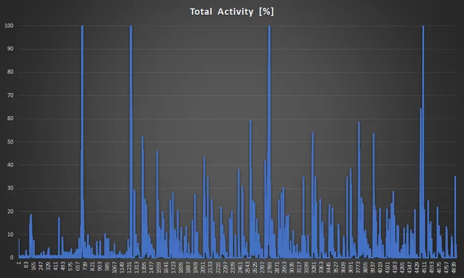 上面的这张图表和smartmontools的记录都可以确认,在整个PCMark 8存储测试的过程中致钛PC005 Active没有发生过热和限速事件,这是一个好消息!接下来我们分析上面这张图表中的更多深度内容。首先是读写速度,从图中我们可以看到峰值是出现在1247秒时,HWiNFO64记录到1101MB/s读取、1550MB/s写入。而在绝大多数时间内,读写速度都在200MB/s甚至更低的水平上。下图中单独把SSD活动时间拿出来看,100%满载的情况出现过很少的几次,而多数时候SSD活动时间是在60%以内,前面的满载测试只是人为创造了一个极端的使用条件,已经远远地超过了正常使用强度,所以才会有频繁的过热和限速发生。