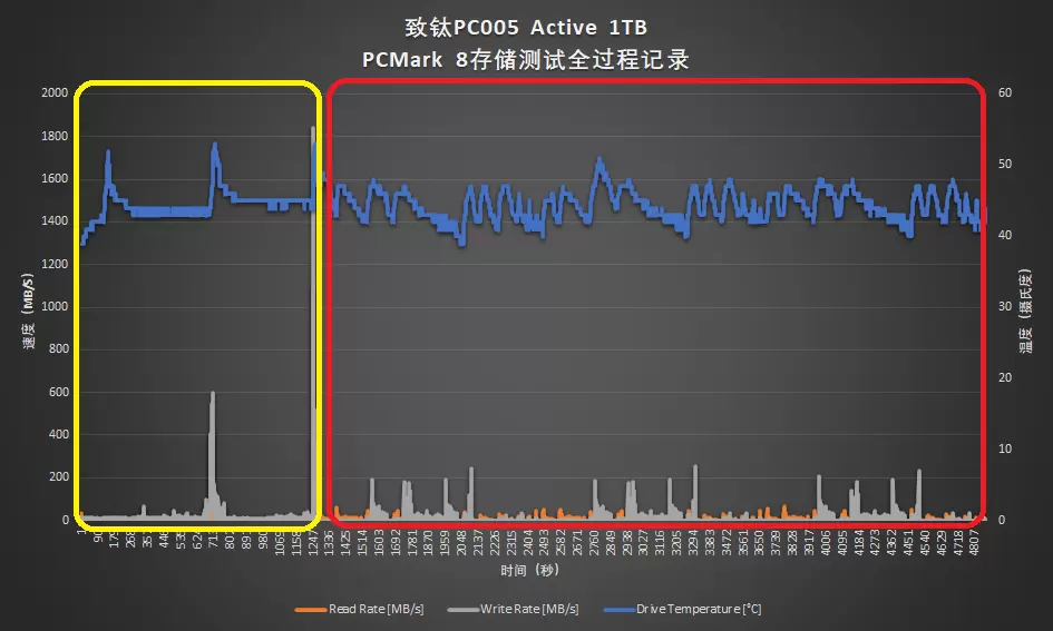 回到读写速度图表来看,整个PCMark 8存储测试其实可以分成两部分,第一部分(黄色框内)是预填充的准备阶段,耗时主要跟SSD的容量有关。红色框内的第二部分有3个测试循环,每个循环都包括了魔兽世界游戏加载、战地3游戏加载、Photoshop轻度应用、Photoshop重度应用、InDesign应用、After Effects应用、Illustrator应用、Word应用、Excel应用和PowerPoint应用过程中SSD的读写负载。