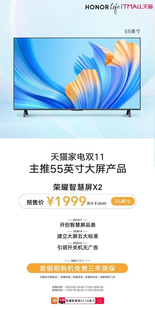 10月18日,荣耀智慧屏X2系列正式公布首销优惠价,65英寸版本为2699元,55英寸版本为1999元。不仅价格优惠十分给力,用户在首销日购买荣耀智慧屏X2系列还将获得整机3年质保服务,产品体验更加超值。