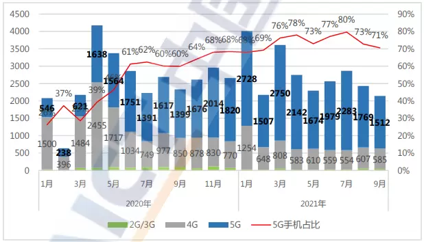 2021年9月,国内市场手机出货量2144.0万部,同比下降8.1%,其中,5G手机1511.8万部,同比增长8.1%,占同期手机出货量的70.5%。