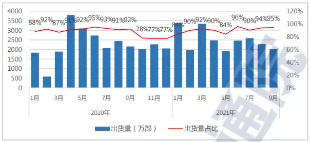 2021年1-9月,国产品牌手机出货量累计2.24亿部,同比增长8.9%,占同期手机出货量的90.3%;上市新机型累计320款,同比增长0.6%,占同期手机上市新机型数量的90.4%。