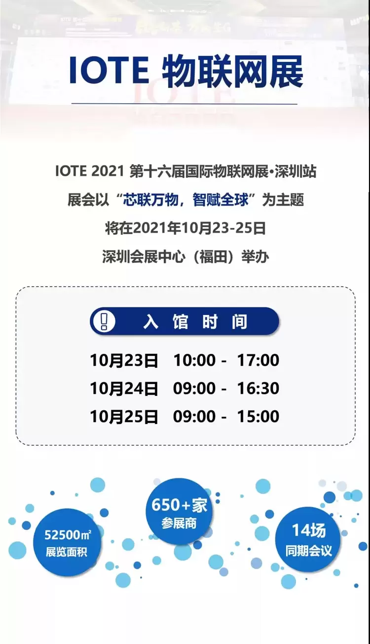 IOTE 2021国际物联网展即将于10月23-25日在深圳会展中心(福田)1/2/6号馆举办,作为物联网少有的全产业链集聚的展示平台,将聚焦更多国内外物联网行业的头部企业,展示2021最新的物联网技术产品及解决方案。