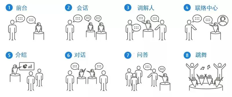 机器人还可以充当对话以外的调解人。例如,假设将机器人放置在活动场所的几个地点,而支持人员则在联络中心等候。一个需要帮助的游客问机器人一个问题。如果这是一个简单的问题,机器人可以自己回答。然而,如果问题是复杂的,机器人可以访问联络中心,在联络中心的工作人员可以通过机器人对问题进行解答。