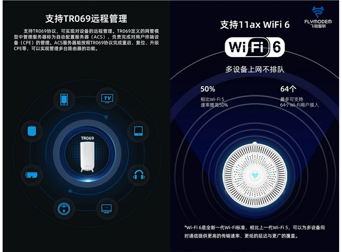 飞猫智联FM10支持WiFi 6协议,并同时兼容前代WiFi 协议(802.11b/g/n/ac),低延时、高速率的同时可稳定连接几十台终端,可支持市面上几乎所有主流智能家居设备。同时,还兼容TR069网络管理协议,可为行业提供更高效稳定的网络管理。