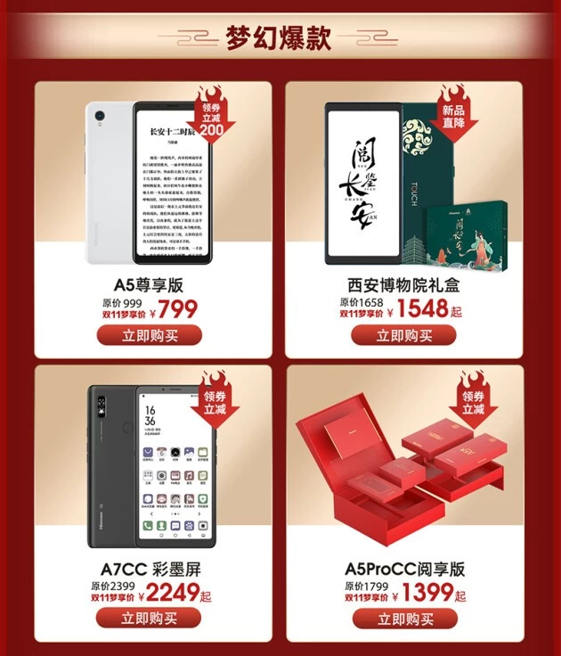 对于阅读爱好者来说,海信TOUCH音乐阅读器当属首选,该产品配备大尺寸护眼水墨屏并融合顶级Hi-Fi解码芯片,让阅读和学习从此有“乐”为伴,多级智能化亮度和色温调节结合暖色补光灯,带来全天候的舒适阅读体验。该产品的西安博物院联名礼盒套装包含了多款西安博物院典藏级精美礼品因而更为值得推荐,到手价仅1548元。