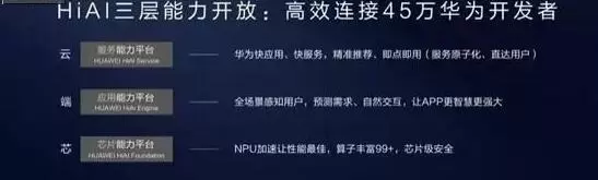 HiAI包括“芯-端-云”三层,芯片层包括NPU的加速、丰富的算子和芯片级的安全保护;端层包括端侧的全场景用户感知和交互体验,赋予APP更强大的人工智能的能力。云层则是通过华为移动服务(HMS)、AppGallery等满足消费者个性化的使用。