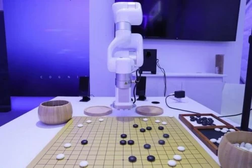在X技术区,有一个白色的弈棋机器人静立以待。别看它其貌不扬,看着像一支机械手臂,但其实它下围棋的水平很高,达到职业九段。不信,挑战一下,相信即刻完败的感觉会让你“无比酸爽”。