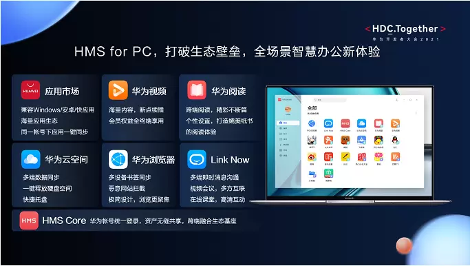 HMS Core面向PC端开放,也进一步加速了跨生态协同,助力智慧办公体验升级。比如,基于华为帐号,针对PC端移动应用做了窗口化、单点登录及扫码支付等定制化服务,更方便用户在桌面环境下使用,开发者无需额外适配,即可提升PC端变现效率。