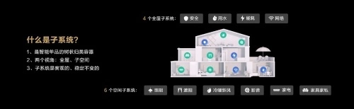 升级后的“N”代表子系统,科学分类的子系统构筑了丰富的使用场景,进一步提升用户体验。子系统可以细分为6个空间子系统和4个全屋子系统,其中,空间子系统与房间定位强相关,包括照明、遮阳、影音、冷暖新风、家具家私、家电系统;全屋子系统的功能则不受空间限制,包括网络、安全、用水、能耗。