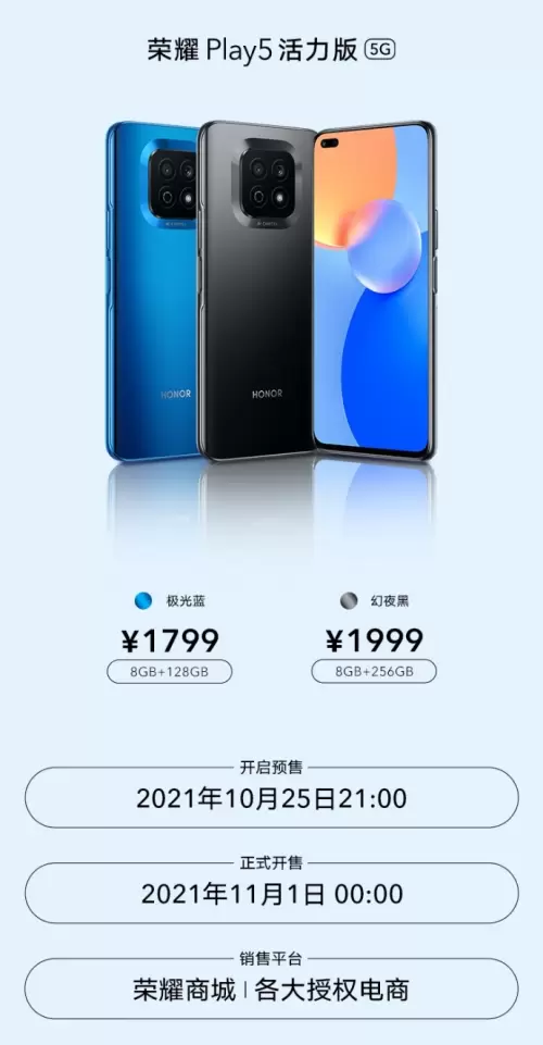 荣耀Play5活力版10月25日21:00开启预售,11月1日0点在荣耀商城及各大授权电商平台正式开售。8GB+128GB版售价1799元,8GB+256GB版售价1999元。