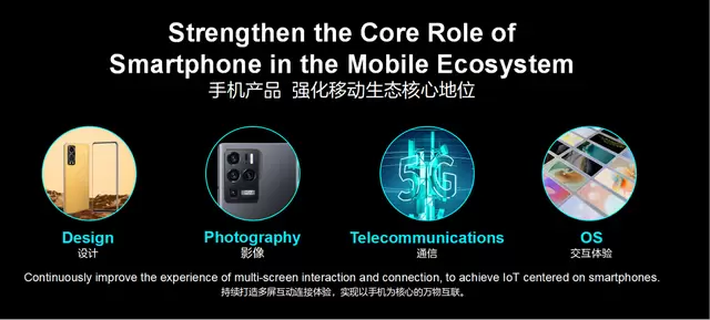 首先,手机作为生态的核心,要进一步强化其移动互联核心的角色和地位。一方面,在四个主要方向强化手机本身的产品力:以设计牵引产品,塑造更年轻时尚的产品形象;面向“影像”主流趋势,推进手机影像功能革新,继续引领计算摄影新趋势;依托5G通信技术优势,作为通信专家,满足消费者痛点需求;加强OS升级和交互优化,提升用户体验。另一方面,持续打造多屏互动连接,进而实现以手机为核心的智能终端互通互联。