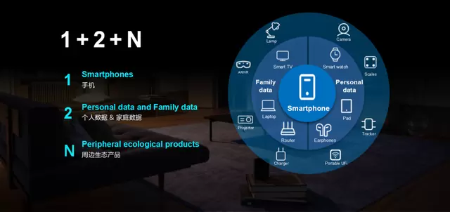 在做好手机和移动互联产品基础上,持续完善“1+2+N”战略生态,推动硬件-软件-服务-生态的转化和演进。其中,“1”指代手机产品,为移动互联生态的核心。“2”是个人数据和家庭数据两大类终端产品,“N”代表周边生态产品。通过大终端打造,构建出庞大的产品阵容,覆盖全场景。