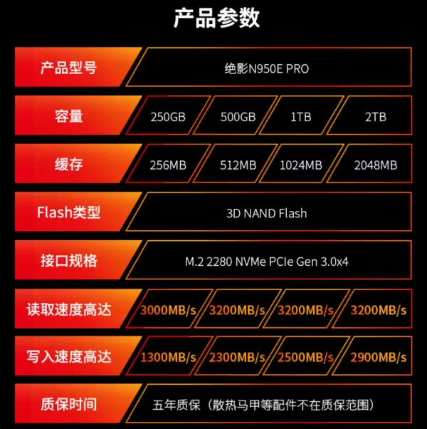 从朗科的官网查询到,朗科N950E Pro属于“绝影”系列,定位高端,有多种容量可供选择,不同容量对应不同的缓存。接口规格为常见的M.2 2280 NVMe PCIe Gen 3.0 x4,其中1TB版本连续读取速度高达3200MB/s,写入速度高达2500MB/s,并提供五年质保。从参数来看,甚是强悍,具体表现如何,我们接着往下看。