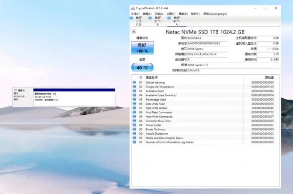 通过CrystalDiskInfo查看硬盘信息,可以看到朗科N950E Pro的固件版本为42G2U67A,传输模式为PCIe 3.0 x4,支持NVMe 1.3标准和S.M.A.R.T功能。通电次数为2次,待机温度为40°C,证明是新盘无疑。