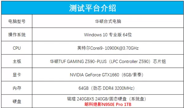 看完朗科N950E Pro的靓丽外观后,是不是更期待它的性能表现呢?下面,便进入测试环节。以下是我使用的测试平台: