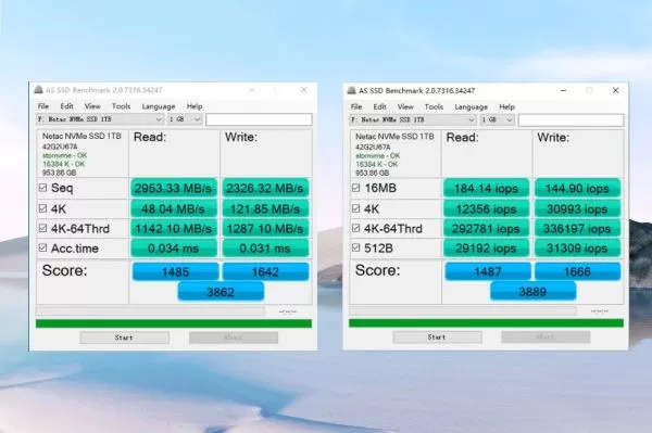 使用AS SSD软件进行读写速度测试,在1GB大小下,朗科N950E Pro的4K多线程读取速度为1142.1MB/s,写入速度为1287.1MB/s,换算成iops则分别达到292781、336197。