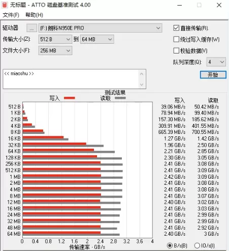 ATTO会使用不同的数据包按512B到64MB进行分别读写测试,测试完成后数据用柱状图的形式表达出来,很好的说明了文件大小比例不同对磁盘速度的影响,从而可以判断硬盘的性能。