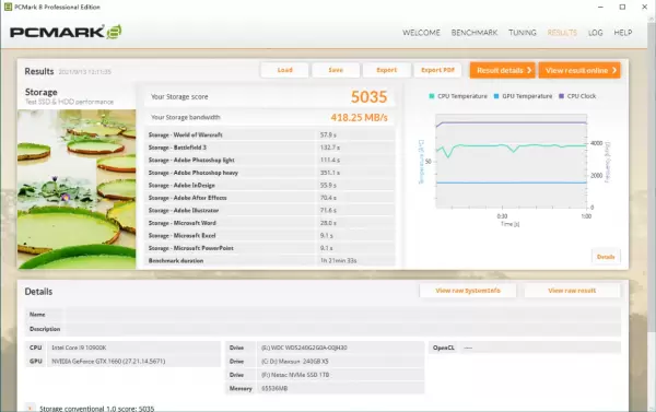 PCMark8内置了多个测试项目,其中Storage测试项目针对硬盘性能做出评定,包括两款大型游戏以及各种办公应用测试。