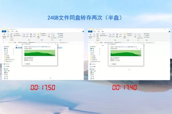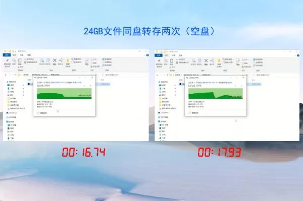 在空盘状态下,我将24GB的文件同盘转存两次,两次完成的时间都在17秒左右,这一表现可以说很是亮眼。