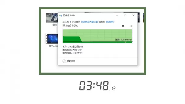 光看这个成绩对很多人来说可能并没有太大触动。为此,我将之前测过的SATA固态硬盘的成绩作为对比,相同文件同盘转存,该SATA固态硬盘耗时3分48秒。相比之下,朗科N950E Pro的表现称得上是疾速了。