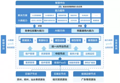 统一AI平台与磐基PaaS的深度融合大大缓解了云中心的工作负载,在云与端之间新增了若干个边缘计算中心,构建云-边-端协同处理架构,推进资源、数据与算力的互融互通,实现云计算服务一个底座、统一调度,促进加速AI赋能全网的进程。