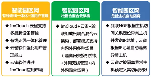 混合云架构:ImCloud+云雀+巽联组成松耦合混合云架构,部署模式支持内网、外网多种场景(隔离网交换机控制+外网无线管理+内网混合场景),适配各种网络环境;