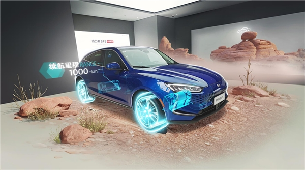 现场,通过AR技术呈现动态特效和参数文字,用户可以直观并生动地感受车辆的续航里程和百公里加速性能;通过AR技术呈现的车辆加油与充电的场景、四缸增程器在加油后输送电能的过程,以及高功耗场景下车辆电机表现出的强劲动力,能让消费者进一步了解车辆的性能动力。