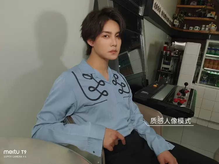 美图T9的镜头下,尹正气质也随着造型百变。在一组室内的照片中,美图T9质感人像模式下的尹正,身穿淡蓝色衬衫,眼神忧郁,化身气质优雅的王子。无暇的雾面肌,搭配胶片感色彩,照片氛围和尹正的气质相得益彰。