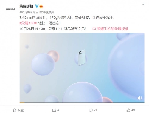 前不久荣耀官宣将于10月28日11.11新品发布会上推出荣耀X30i,今日荣耀手机官方微博发布了一则关于荣耀X30i的预热视频。在展示其轻薄设计的同时,也正式揭晓了这款“会轻功”手机的7.45mm超薄机身和175g轻盈重量。
