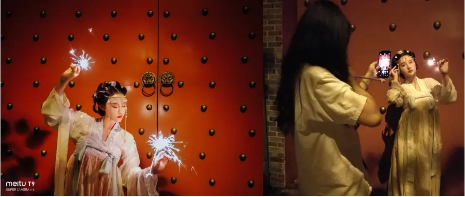 夜景拍摄也一直是美图系列手机的“王牌”。这张照片是在一个全黑的环境下,只靠一根电光花来作为主光源进行拍摄。照片人物没有出现拖影,色彩还原、色调都有积极出色的表现。这是因为美图T9的1.4μm大感光元件会让噪点降到最低;F1.8大光圈让你拥有单反镜头一样的拍摄通光性能;以及前后置均搭载全像素PDAF对焦与最快能在0.03s内完成拍摄。