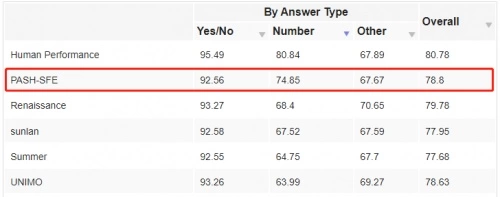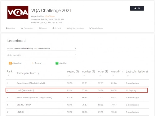在2021年国际权威视觉问答VQA(Visual Question Answering)竞赛这一涉及视觉-文本多模态理解的高阶认知任务中,由平安医疗科技、平安健康和平安智慧城市组成的联合团队(PingAn Smart Healthcare, PASH-SFE)基于赛飞AI平台强大的模型训练和推理能力,夺取“识数”任务单项冠军,比赛榜总榜第二的好成绩!战胜了包括百度、NYU、微软等在内的55支知名队伍。比赛截止后,联合团队在公开榜上继续提升2个点,将总分提高到80.78, 相较于人类基准水平仅相差0.05!