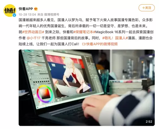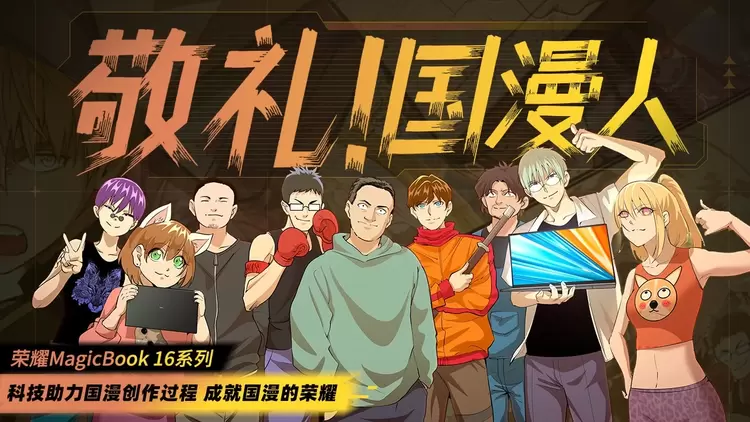荣耀MagicBook16系列通过与快看漫画合作,推出“致敬!国漫人”视频这一动作,进一步展示了国漫的文化氛围和创作热情,同时也让更多人看到了国漫的文化价值。同时荣耀通过其笔记本产品用科技助力国漫的发展,也展示了荣耀作为科技企业对文化创作,以及青年艺术群体的重视和觉悟。