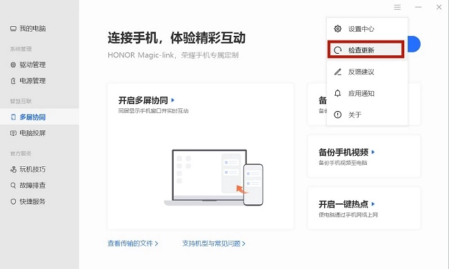 想要体验以上功能的用户,现在就可以在荣耀笔记本上打开“电脑管家”,检查版本更新,即可看到新版本的升级,在升级完成后即可享受更好更畅快的智慧互联新体验。